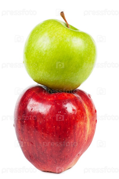 Зеленое и красное яблоко крупным планом на белом фоне