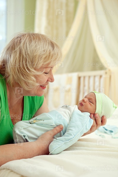 Счастливая бабушка с новорожденным внуком на руках