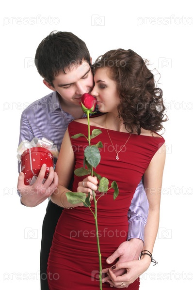 Красивая молодая пара с красной розой и подарком на белом фоне