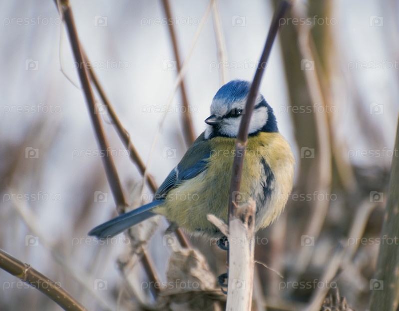 Синичка лазоревка сидит в ветках кустарника
