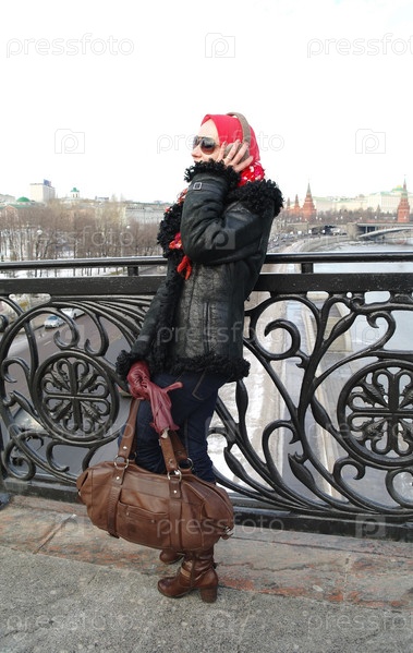 Девушка в наушниках на мосту зимой, Москва, Россия