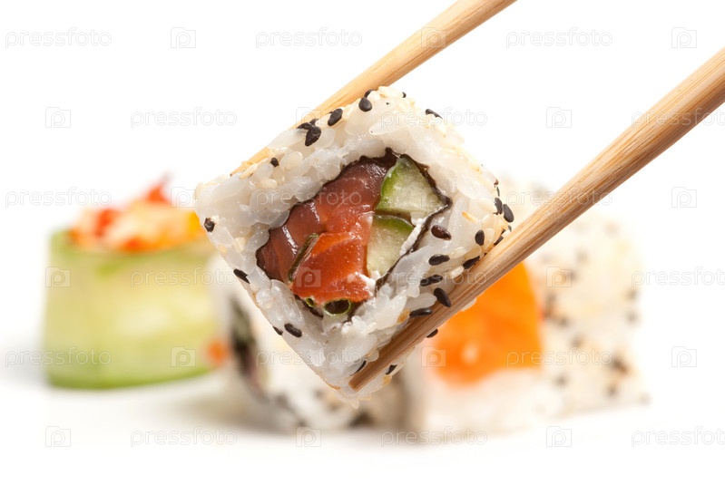 Палочки для еды держат суши ролл