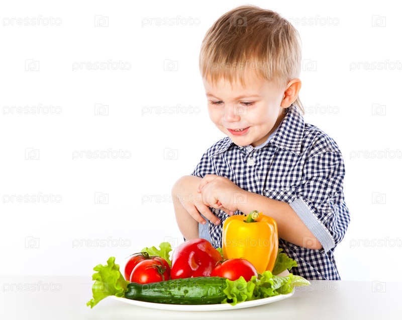 Мальчик и тарелка с овощами на белом фоне