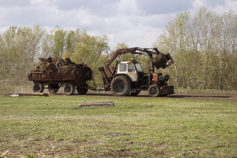 Трактор с телегой груженой навозом. Деревенская жизнь