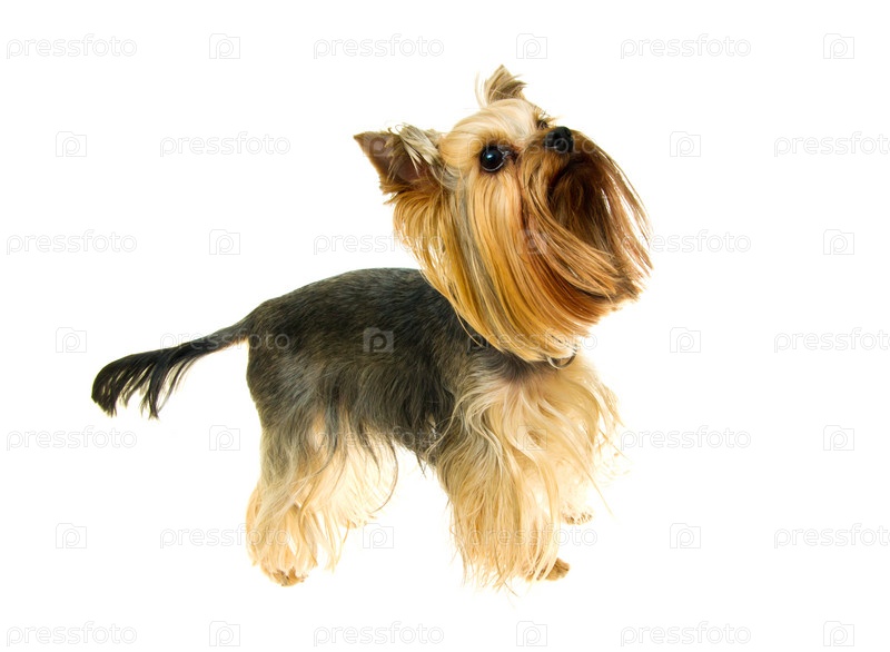 Йоркширский терьер стоит и смотрит наверх