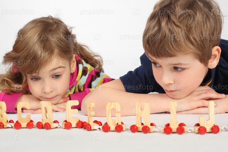 Маленькие брат и сестра учат английский алфавит на белом фоне
