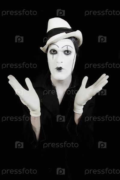 Мим в шляпе с белым макияжем на черном фоне