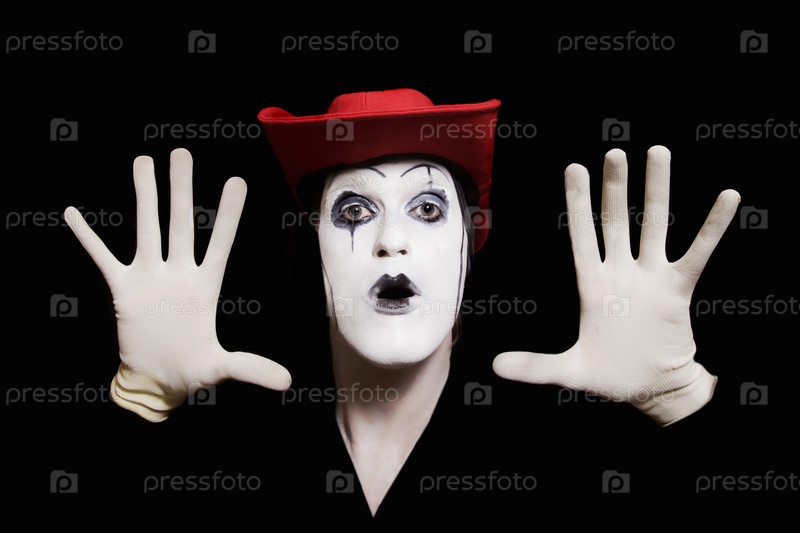 Мим в шляпе с белым макияжем на черном фоне