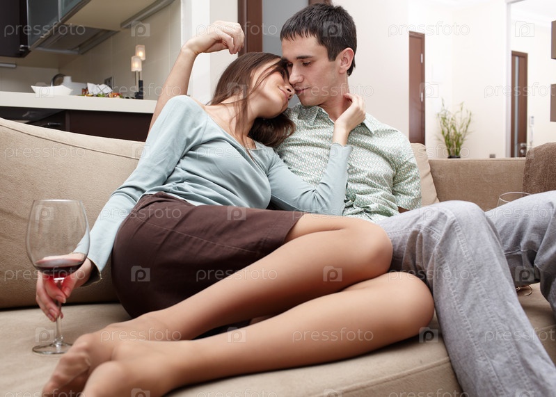 Счастливые молодожены с вином отдыхают на диване