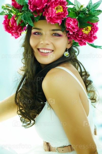 Девушка в пионовом венке и белом платье