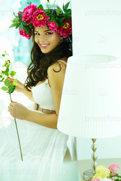 Девушка в пионовом венке и белом платье