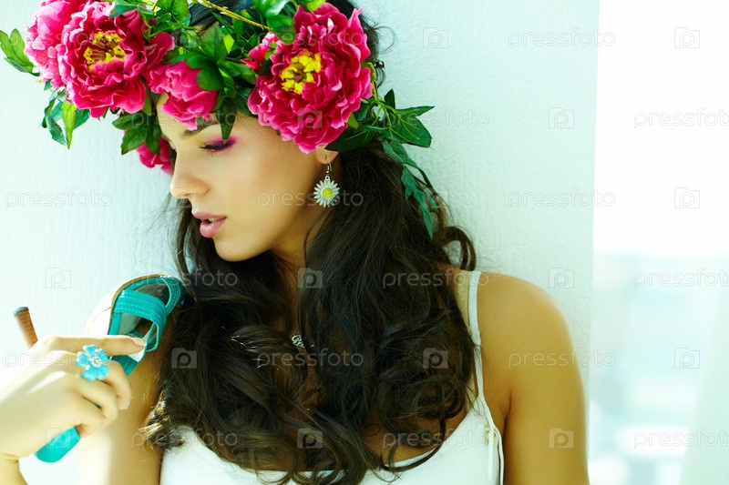 Девушка в пионовом венке с голубой босоножкой в руке