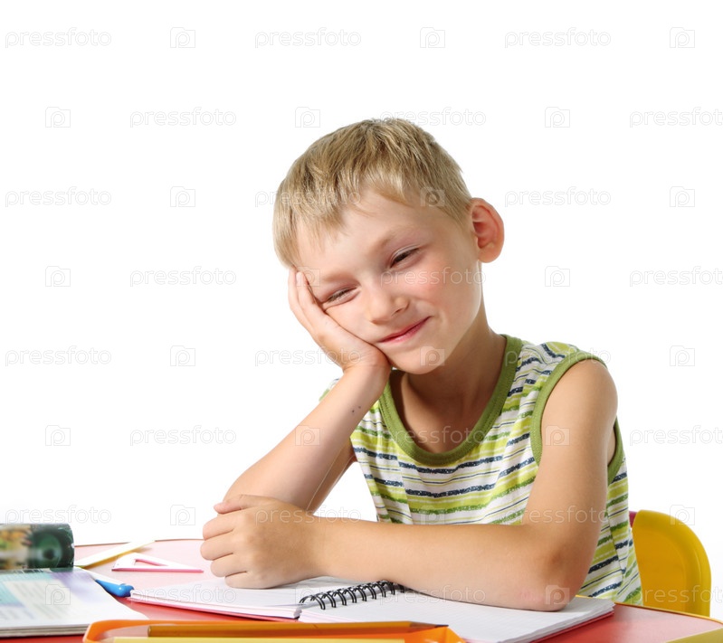 Мальчик мечтает о каникулах, делая уроки