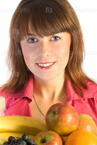 Красивая улыбающаяся девушка с блюдом из фруктов