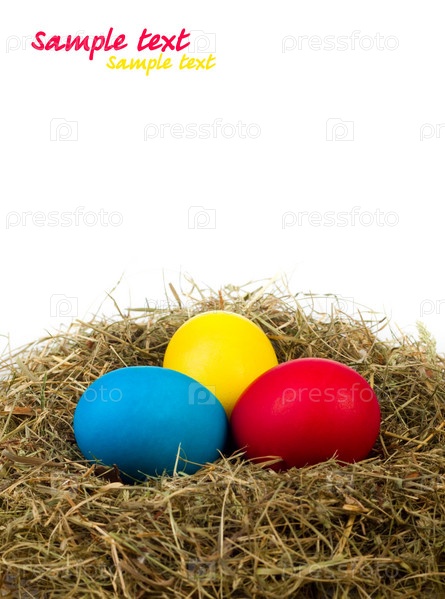 Окрашенные пасхальные яйца, лежащие в птичьем гнезде