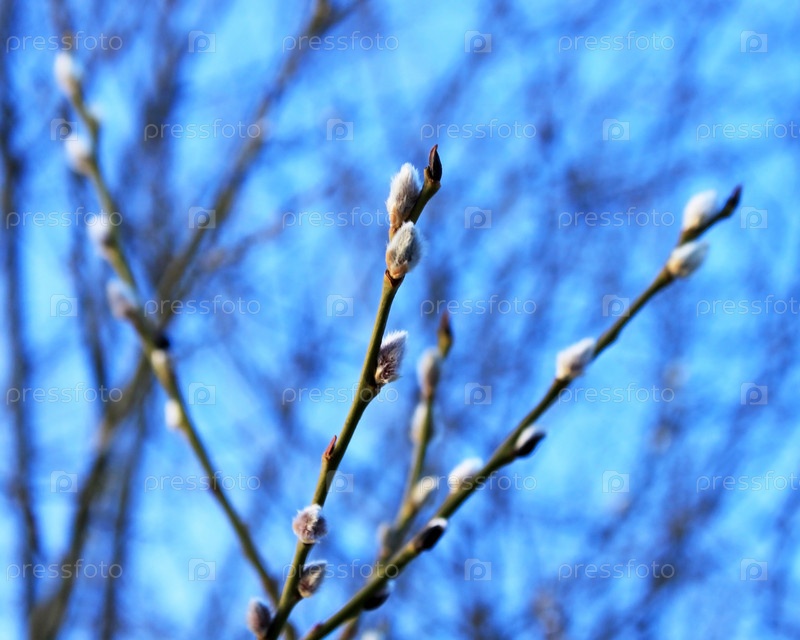 Веточки вербы на фоне веток и неба