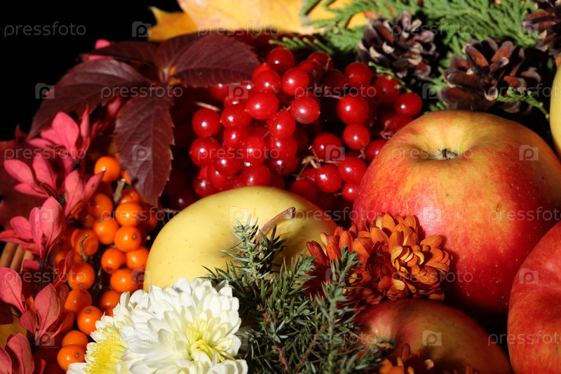 Натюрморт со спелыми фруктами, ягодами и осенними листьями