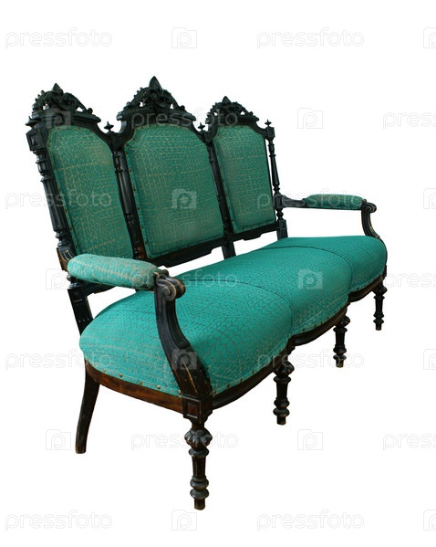 Деревянный мягкий старомодный диван на белом фоне
