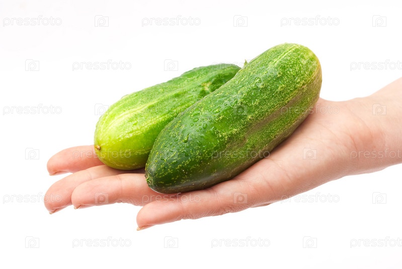 Два огурца на руке на белом фоне