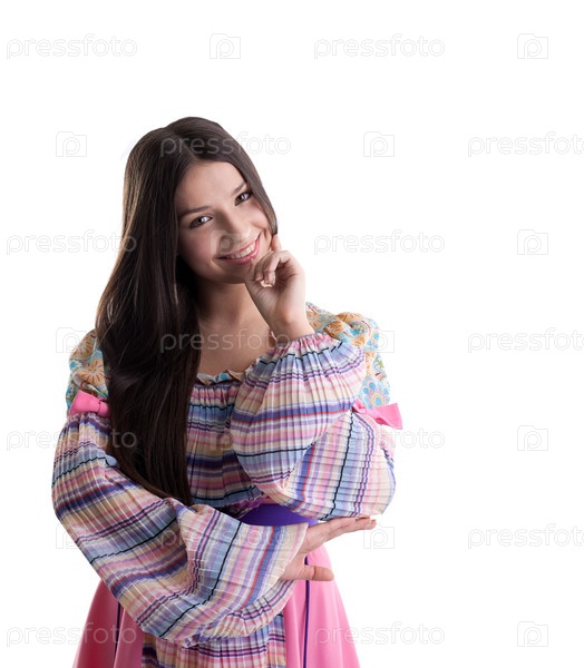 Портрет молодой симпатичной девушки в народном костюме на белом фоне