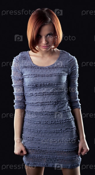 Портрет симпатичной девушки в сером платье на темном фоне