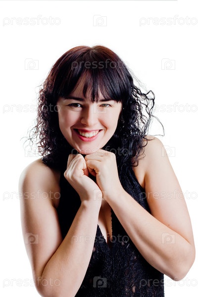 Смеющаяся брюнетка на белом фоне