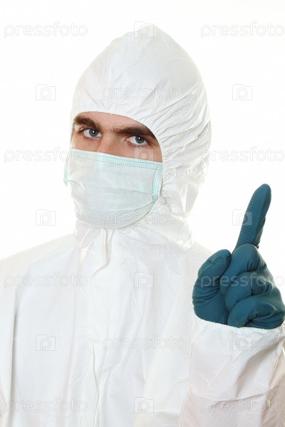 Человек в защитном костюме, маске и респираторе на белом фоне