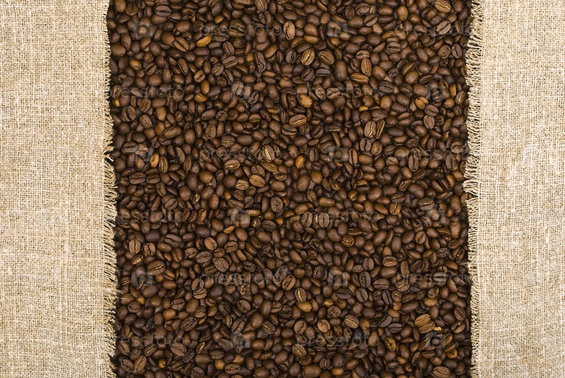 Много кофейных зерен и кусочки льняной ткани по краям