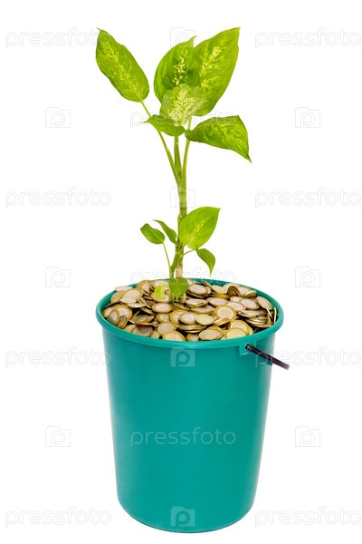 Молодое зеленое растение в ведре с монетами