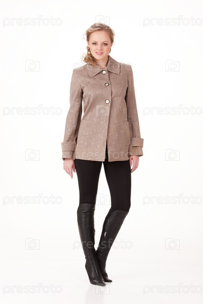 Молодая женщина в модной одежде, изолирована на белом
