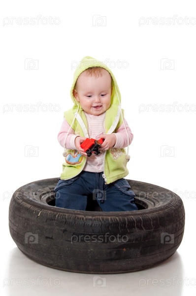 Маленький ребенок с игрушкой сидит в шине от колеса