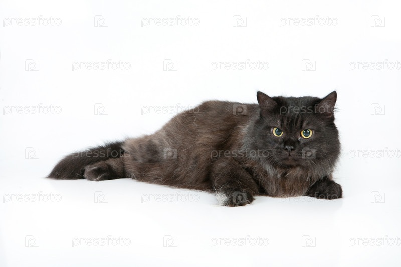 Черный пушистый кот на белом фоне