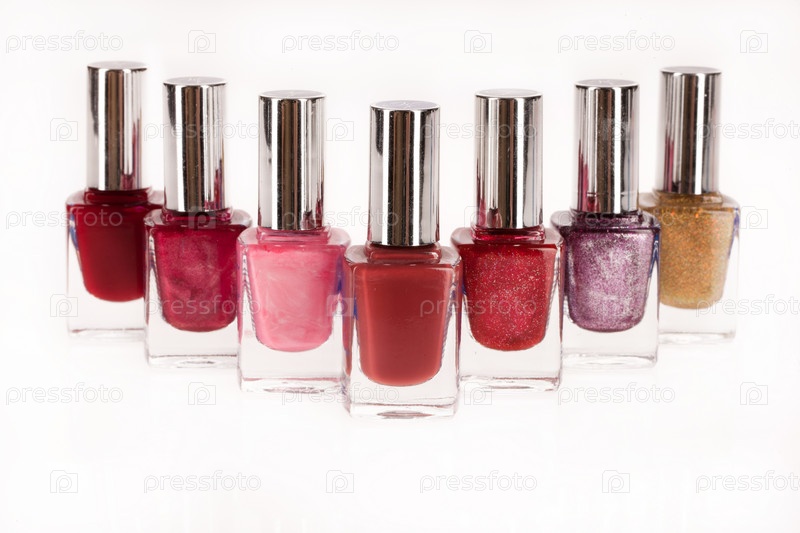 Бутылочки с лаком для ногтей на белом фоне