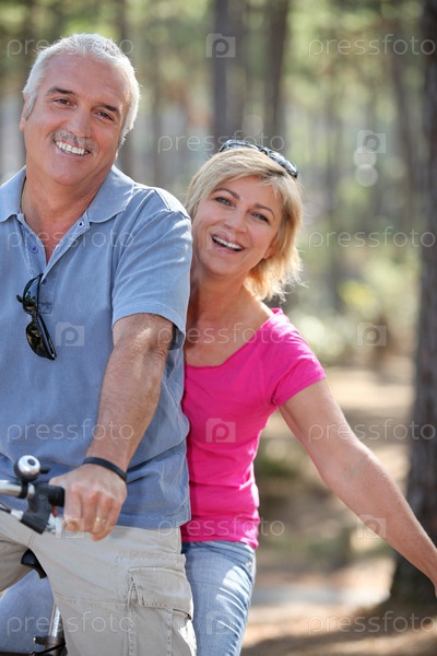 Мужчина и женщина на велосипеде в лесу