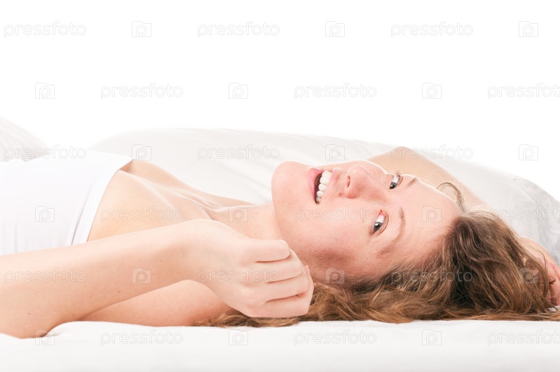 Счастливая женщина лежит в постели утром
