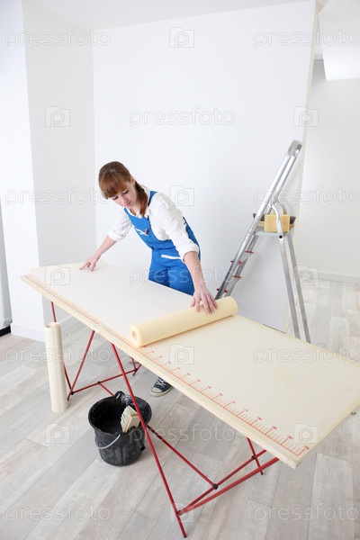 Женщина клеит обои