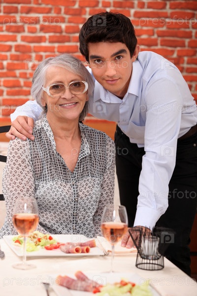 Подросток и пожилая женщина в ресторане