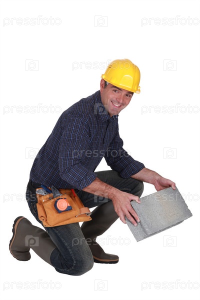 Рабочий держит каменный блок