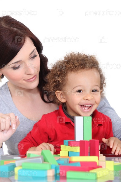 Мать играет с сыном в кубики