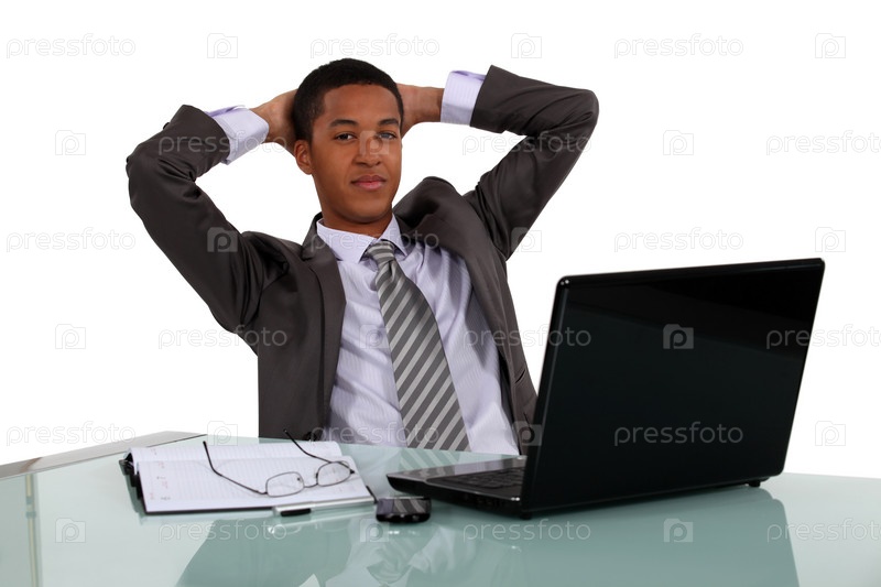 Расслабленный бизнесмен сидит за ноутбуком