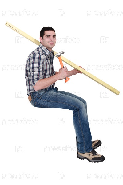 Столяр сидит с доской и молотком