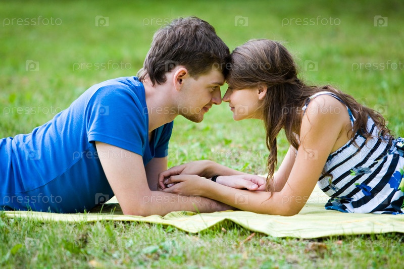 Фото красавицы и красивого парня, лежащих на зеленой траве друг перед другом и касающихся друг друга