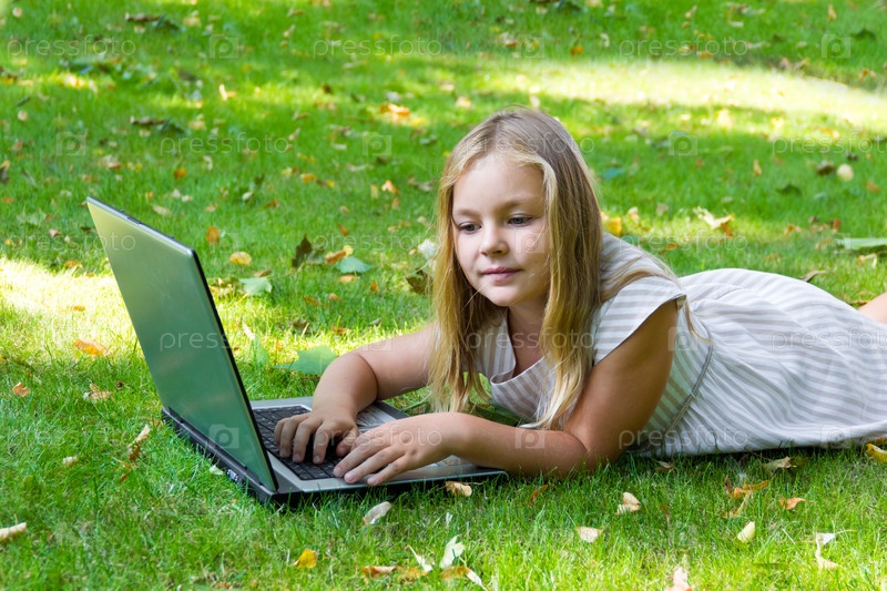Девочка с ноутбуком на зеленой траве