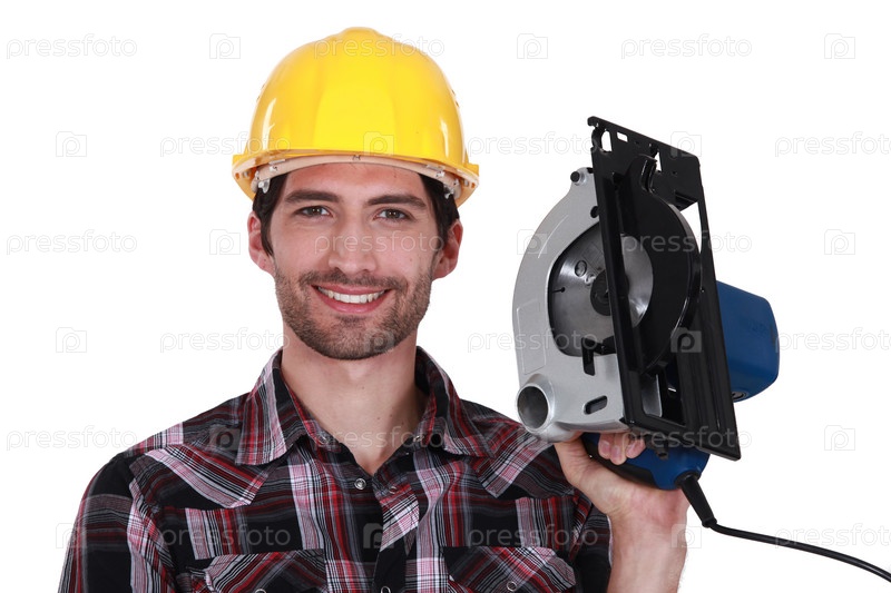 Мужчина гордо держит электрическую пилу