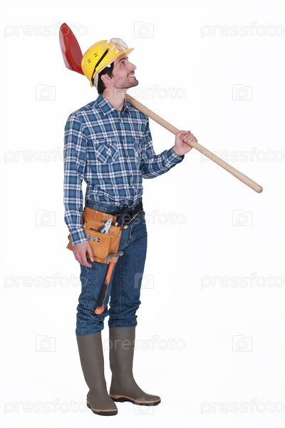 Рабочий держит лопату