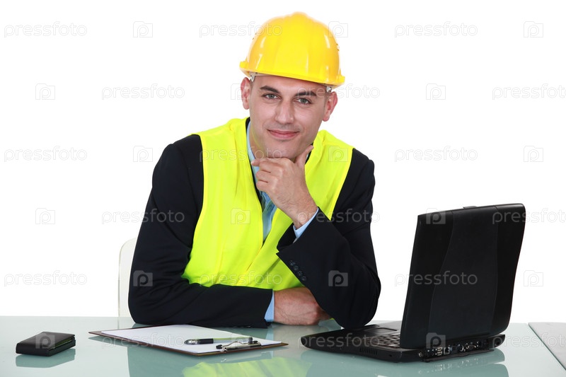 Инженер сидит с ноутбуком