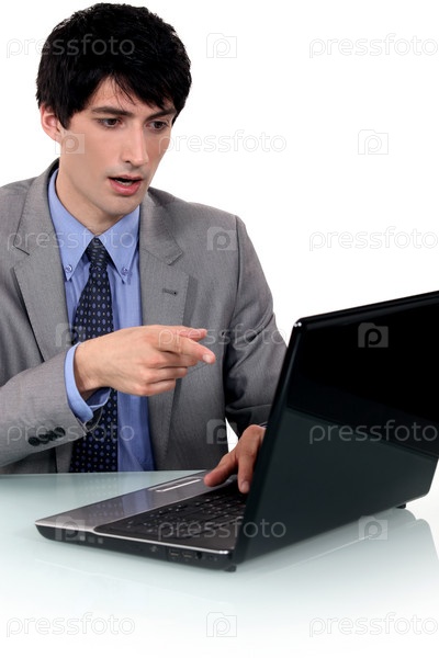 Удивленный бизнесмен указывает на ноутбук