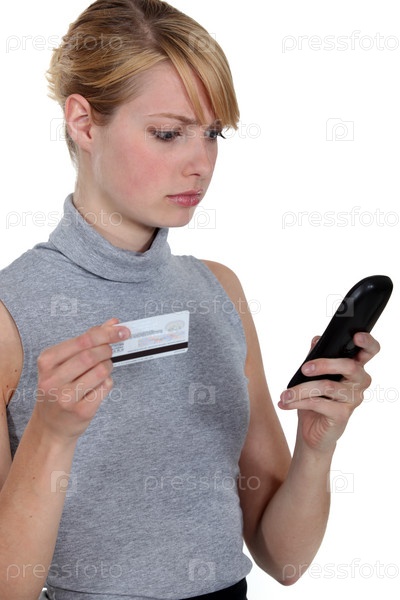 Женщина оплачивкает счет по телефону