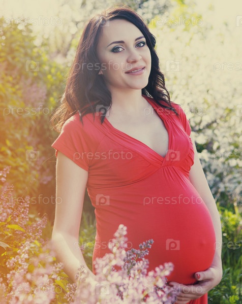 Портрет красивой беременной женщины в красном платье