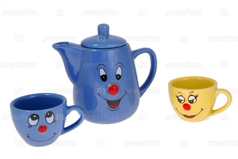 Чайник и чашки с забавным рисунком, изолированные на белом фоне